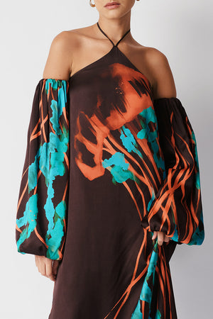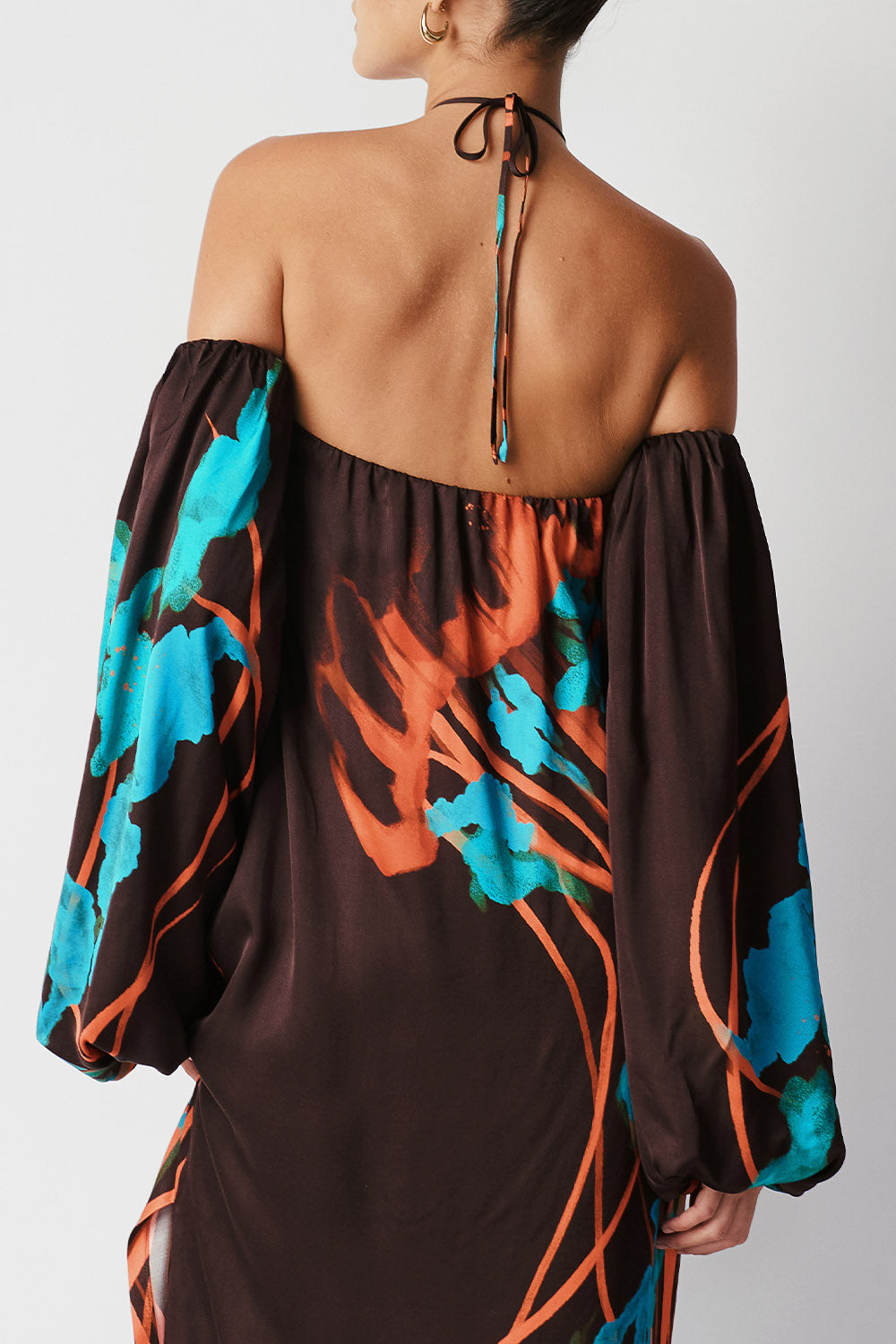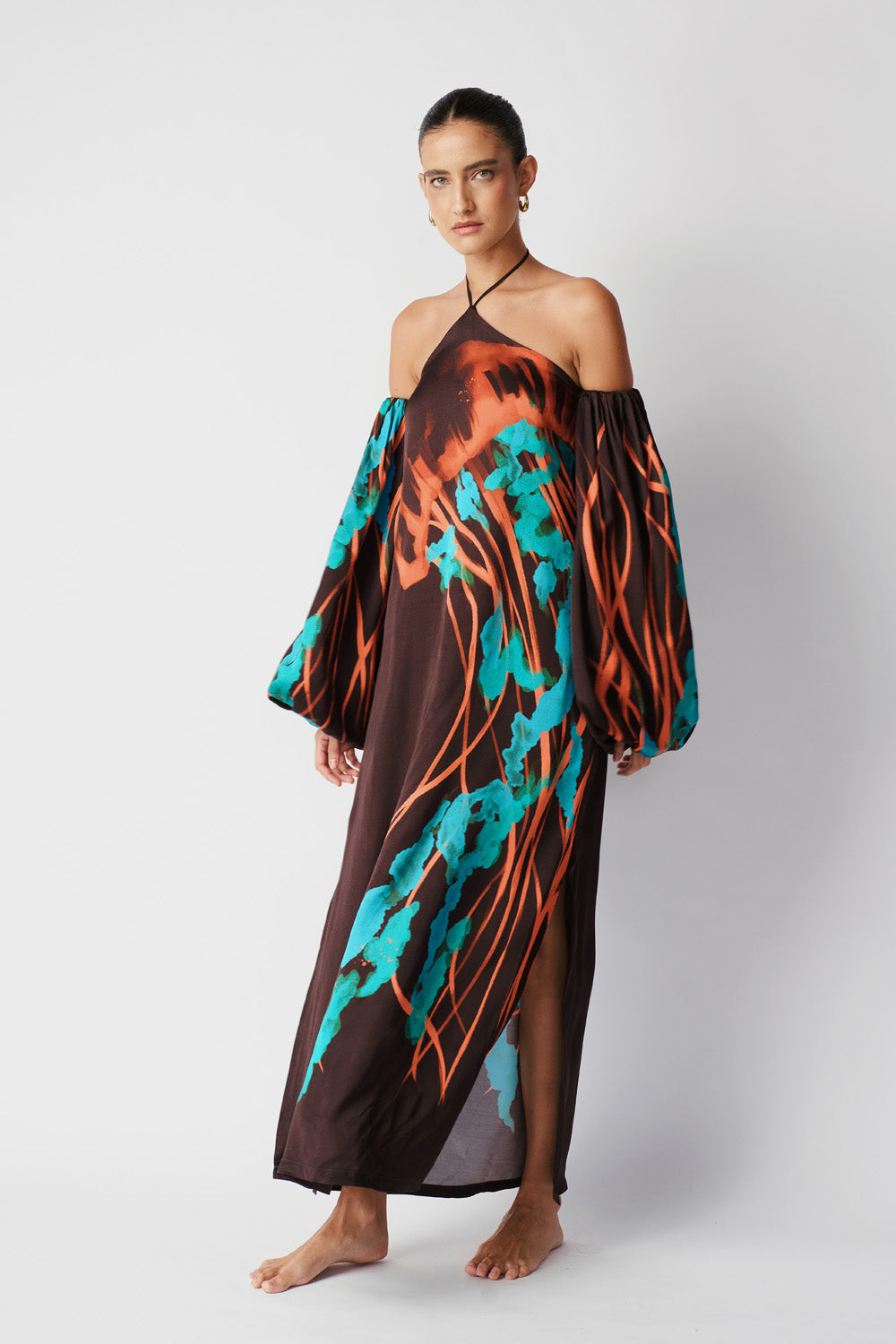 A flowing maxi dress with removable sleeves. Features an asymmetrical neckline and adjustable straps for a tailored fit.