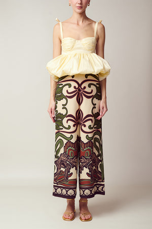 High-waisted wide length pants adorned with a tropical-inspired print.