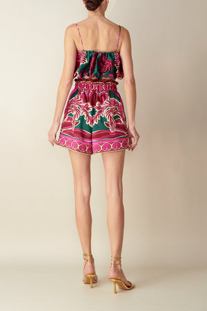 A puffed crop top with a tropical-inspired print, featuring an elastic design and thin shoulder straps.