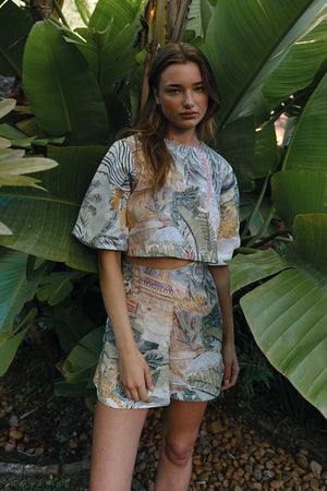 Top in 100% cotton with a tropical-inspired print. A crop-style blouse with a tie-back detail, fresh and versatile to accompany your sun-filled days.