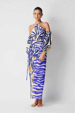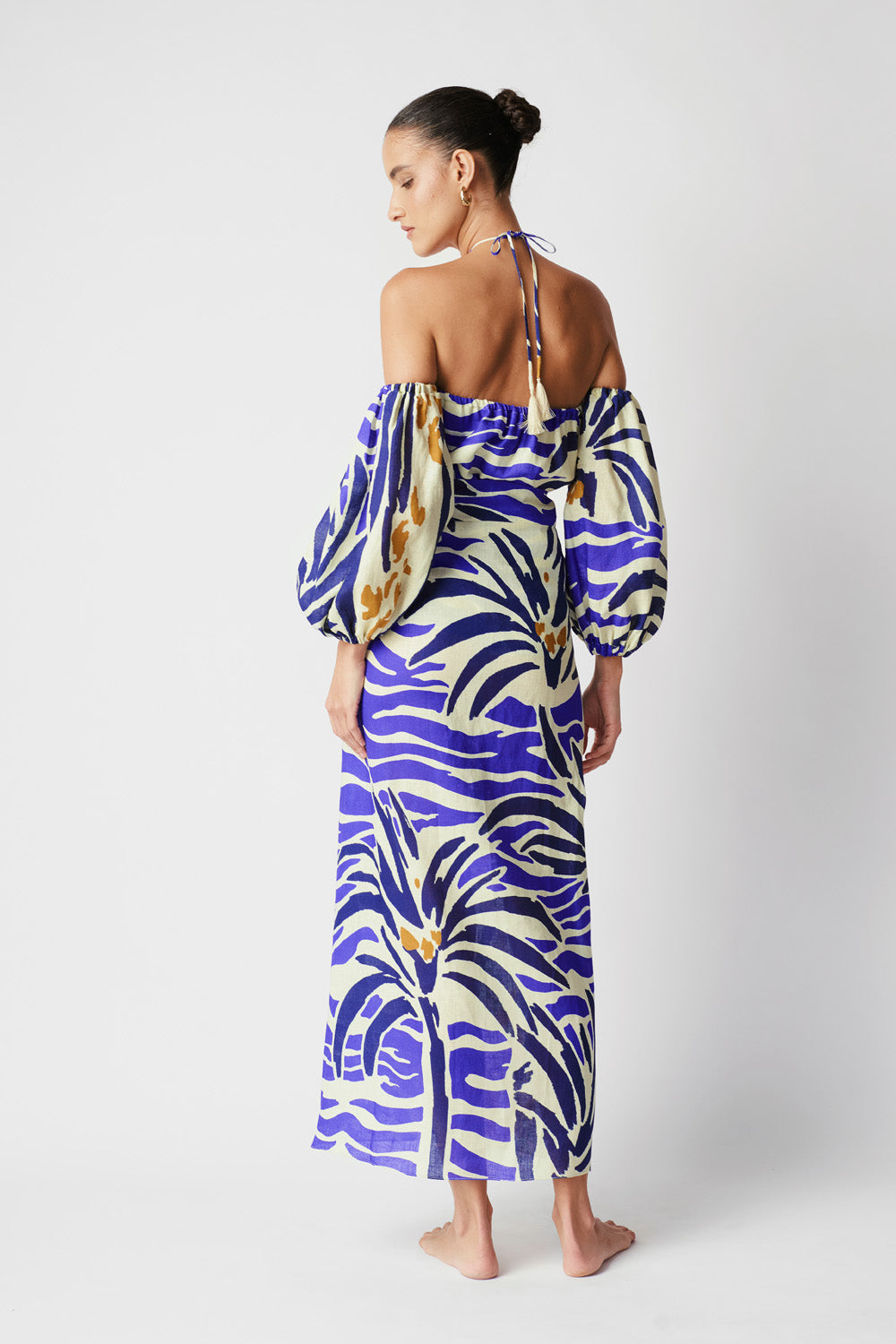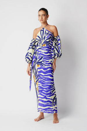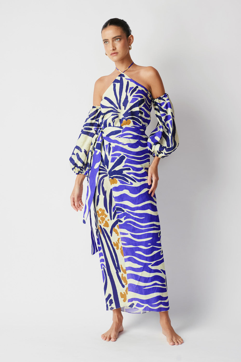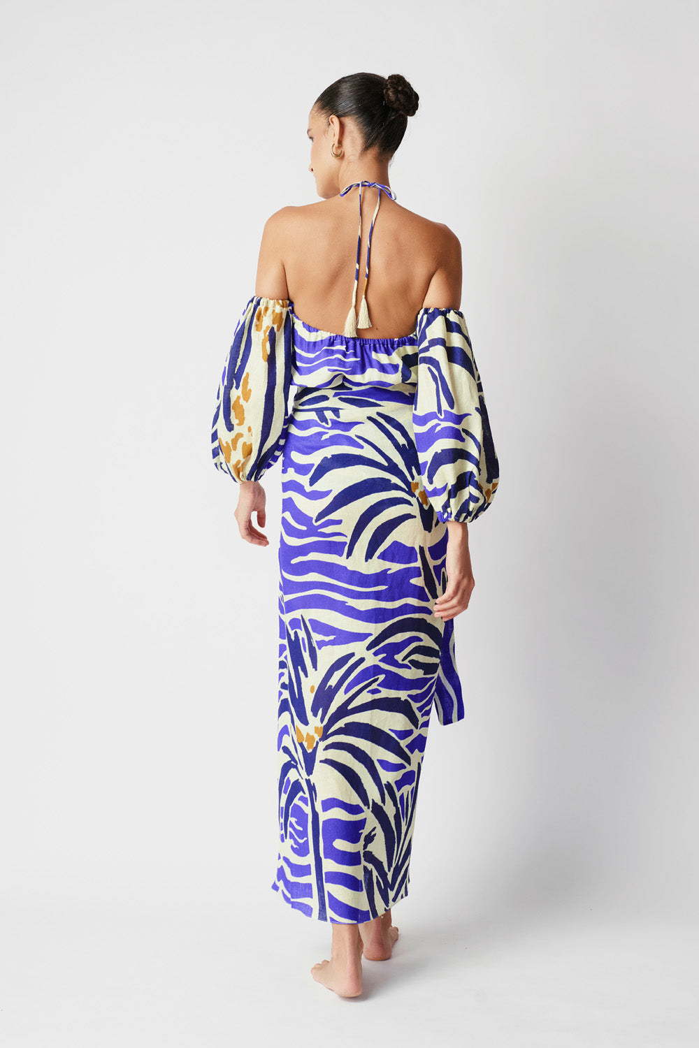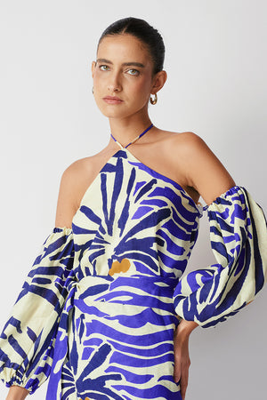 A statement top with an a-neckline design and delicate straps to adjust around the neck. Features long, puffed and removable sleeves.