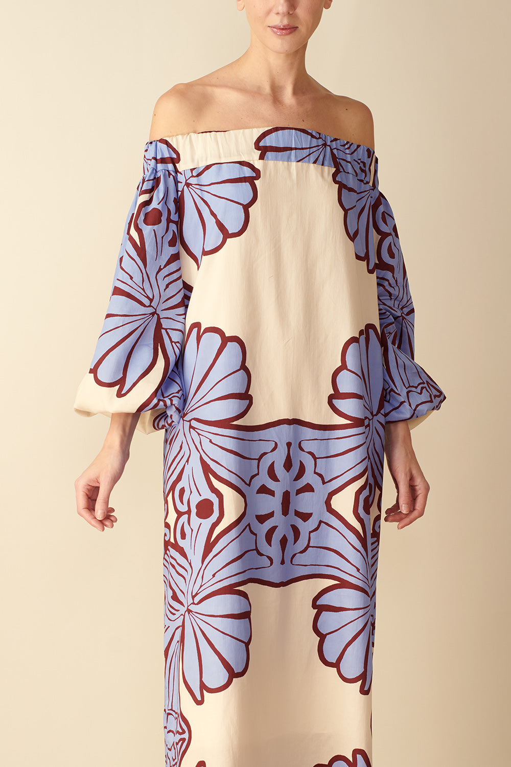 Maxi dress with a strapless design, featuring puffed sleeves and an elastic band for added comfort. 100% Cotton.