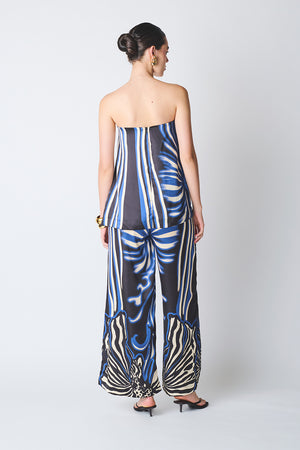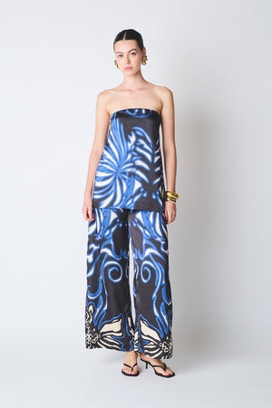 Strapless top with a wide silhouette, elasticized bust, and a back closure.