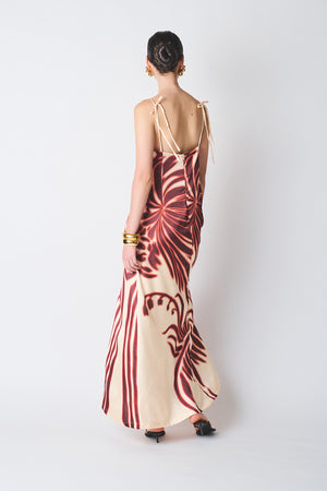 Wide-silhouette dress with pre-shaped cups, four thin straps, and a back closure at the rear.